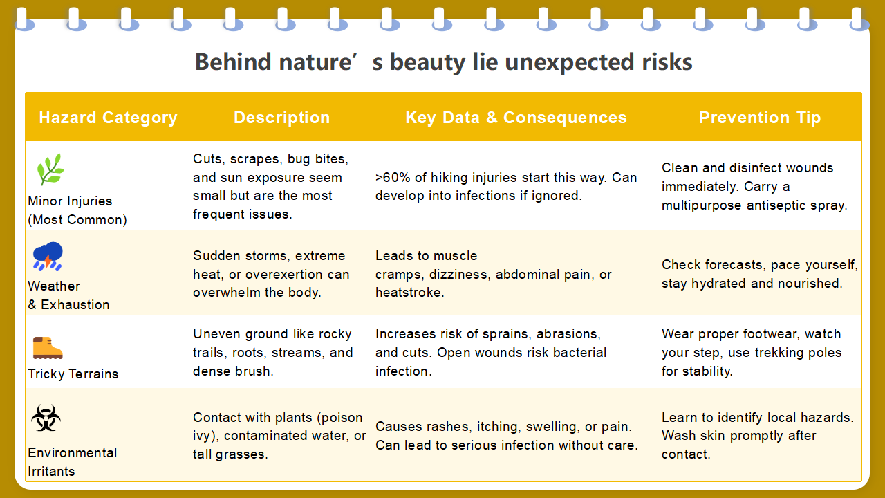 In recent years, hiking has become a popular way for city dwellers to reconnect with nature. Whether you’re a seasoned trekker or a beginner, everyone plans their route and packs essentials: maps, headlamps, tents, cookware, food, and water… Yet, surprisingly, first-aid supplies are often overlooked.